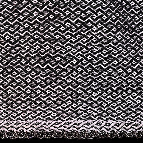 This handwoven scarf showcases a unique Celtic twist pattern, crafted from mercerized cotton and wool yarn in pink and black hues. The fringe is adorned with beads, adding a touch of sparkle. It is a creation of the Fundy Coast Weavery located in New Brunswick.